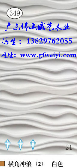 波浪板是源自欧洲的一种新型时尚艺术环保室内装饰板材,是大理石、文化石、天然木皮、贴面板等传统装饰板材料的更新换代产品。威艺立体波浪板是以优质中纤板(根据客户要求选择高中纤板、高密度板、拼板及各类实木板等)为基材,经电脑雕刻出各种花纹,表面采用高超烤漆、贴金银箔等工艺精工制造,能塑造不同的时尚装饰效果。威艺以其品种齐全、线型优美、立体感强、光彩永恒、防潮、防变形、使用方便等性能特点,广泛应用于各种住宅、别墅、夜总会、酒店、会所、商场、写字楼等室内装饰工程之中,并可配套于门业家具,还可用作屏风隔断、壁画,更可取代传统的天花板,营造出高档优雅、个性别具、立体感极强的商住休闲空间。