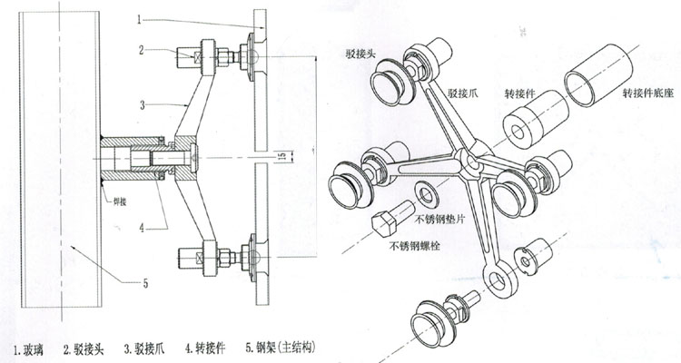 由驳接头、不锈钢驳接爪、转接件等组件组成,其中不锈钢驳接爪在玻璃幕墙中起到衔接的作用,并通过驳接头将其荷载传递给钢结构或其他主体结构上。