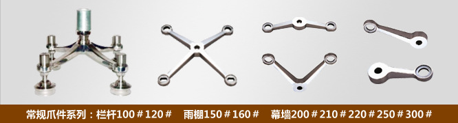 四爪,三爪,两爪90度 ,两爪180度,长单爪,短单爪,K型爪,工字爪,组合爪,气循环爪,立柱配件等。可以满足不同建筑和装饰的需求。