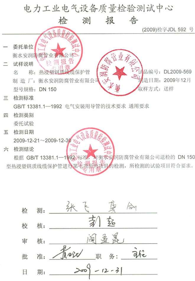 热浸塑钢质线缆保护管13903181365是河北衡水安润管业的主导产品,是我公司采用纳米防腐新材料,利用日本先进设备和热浸塑工艺,实现钢质管道内外防腐的新一代防腐管道产品,是对传统防腐管道的升级换代产品,尤其适用于防腐抗压,外露等特殊要求的过路、过桥电缆保护管的使用。该产品是对新产品、新技术、新工艺的重大突破,比传统防腐管道的防腐能力有显著提高,使其耐老化性能、耐腐蚀性能、力学强度、耐磨性、韧性以及加工性能都得到了显著改善。该产品具有很强的耐老化性能和耐腐蚀性能,机械强度高,承压能力强、耐候性、绝缘性优良,内外表面光滑,摩擦系数小,吸水率低(小于0.003%),适应温度范围大,(—40℃—80℃)等优点。集优质钢管道和纳米防腐管道优点于一身,被广泛应用于全国各个地区的电力、通信、交通、市政、矿山、石油、化工等管道系统建设中。13903181365