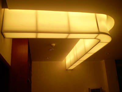 和灯光结合的完美效果:软膜天花的透光膜能有机地同各种灯光系统(如霓虹灯,荧光灯)结合展现完美的室内装饰效果,同时摒弃了玻璃或有机玻璃的笨重,危险以及小块拼装的缺点,已逐步成为新的装饰亮点。