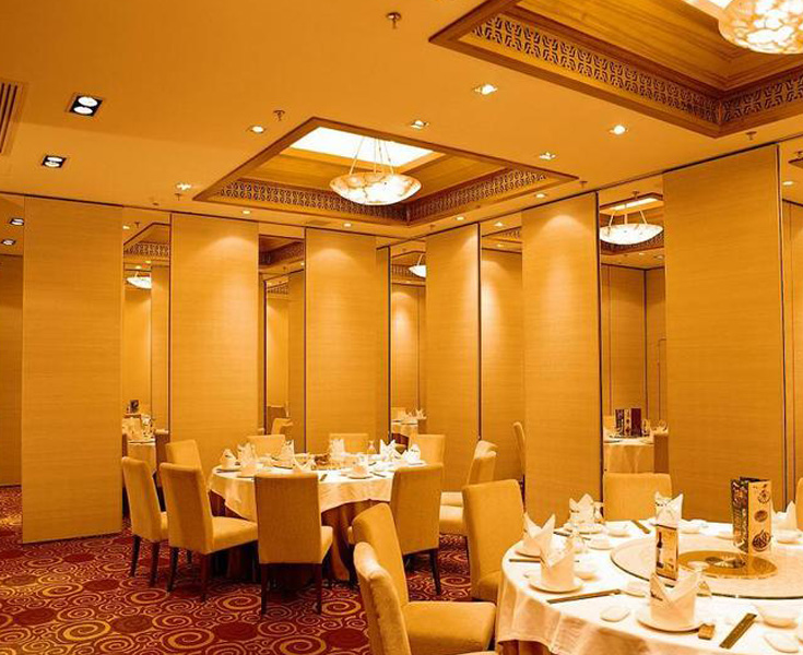 宴会厅移动隔断亦称活动屏风、酒店隔断、餐厅隔断、室内隔断、装饰隔断、屏风隔断、隔音隔墙、移动隔墙、活动隔墙、隔音屏风、隔断门、隔断墙、客厅隔断、高间隔屏风、活动间板。其是一种根据需要随时把大空间分割成小空间或把小空间连成大空间、具有一般墙体功能的活动墙。它具有以下特点:1.无地轨悬挂:地板无轨道,只需将轨安装于天花板上;2.稳定安全:隔断后稳定可靠,不易摆动;3.隔音环保:隔音效果好,最大隔音系数可达53dB;4.隔热节能:隔热性能优良,根据不同入座率,把大空间分割成小空间,以降低空调电耗;5.高效防火:采用高效防火材料制作,防火性能良好;6.美观大方:表面任意装饰,可与室内统一装饰效果;7.收放灵活:隔板收放自如,推动灵活,一个人就可以完成隔断整个过程;8.收藏方便:收板时,隔板可以隐藏在专用储柜中,不影响整体美观;9.应用广泛:应用范围广,可应用于会议厅、展览厅、餐厅、高洁净工厂和办公室等场所。当活动隔断用于展览厅时亦称为移动展板(移动展墙、活动展板、挂画屏风)。