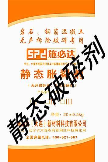 无声膨胀剂(又名:无声破碎剂、静态破碎剂、破石剂、裂石剂、膨胀剂) S-HSCA ,破碎物体时不产生震动、噪音、飞石、粉尘及有毒气体,属无公害 环保型产品,不属易燃、易爆物品。运输、保管安全可靠,使用方便。本品破碎效果稳定,一般可使被破碎物在 8小时以内发生破碎