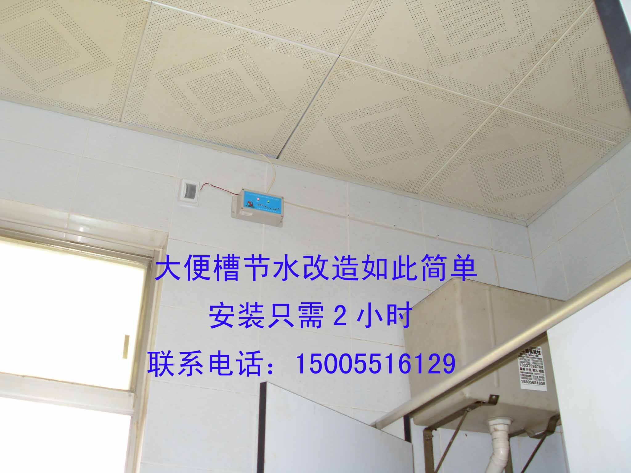 沟槽式公厕节水装置,是在原自动水箱的进水管上加装一个电磁阀,在公厕大便槽或小便槽入口处天花板上安装红外传感器,红外传感器对现场进行自动探测,当有人进入公厕后,红外传感器将探测到的信号送到控制箱,控制箱内的微电脑在进行预定的程序处理后发出指令,控制电磁阀往自动水箱里注水进行冲洗,如果没有人进入公厕,整个系统将“按兵不动”,始终不会冲洗。这样就实现了“无人值守,自动管理,有人则冲,无人则停”的卫生、节水的使用效果。