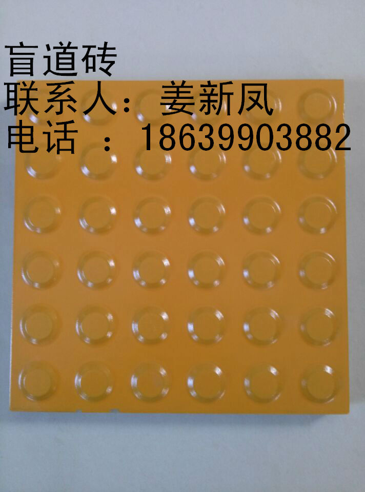 盲道砖是为盲人安全提供的行路方便道路设施。盲道砖由三类砖铺就,一类是条形方向引路砖,引导盲人放心前行,称为行进盲道砖,或盲道方向引路砖;一类是带有圆点的提示砖,提示盲人前面有障碍,该转弯了,称为提示盲道砖,或盲道方位引路砖;最后一类就是盲道危险警告引路砖,圆点较大的,就是警视不要超越,前面危险。我公司生产的盲道砖规格有300*300*20 300*300*25 等,可来图定制。