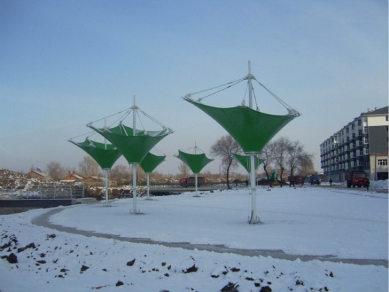 膜结构又叫张拉膜结构(Tensioned Membrane structure),膜结构建筑是21世纪最具代表性与充满前途的建筑形式。打破了纯直线建筑风格的模式,以其独有的优美曲面造型,简洁、明快、刚与柔、力与美的完美组合,呈现给人以耳目一新的感觉,同时给建筑设计师提供了更大的想象和创造空间。
