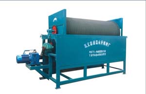 为了防止堵塞,在给矿圆筒内装有一个弱磁场磁极,可预先排出给料中的强磁性矿物。其工作原理与分选过程:矿石由给矿圆筒预先排出强磁性矿物后,被均匀地排到给矿皮带上,并由皮带送到圆盘下面的磁场间隙中,弱磁性矿物受到磁力作用,被吸到圆盘的尖齿上,并随