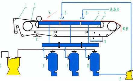A.加料装置 B.淋洗装置 C.纠偏装置 D.清洗装置 E.气液分离器 F.返水泵 G.真空泵 H.橡胶带 I.滤布 J.真空盒 K.磨擦带
