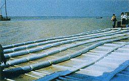 软体排是利用土工织物缝接成一定尺寸的排布,在排布上加铰链接砼预制板块作为压重而形成的一种防冲结构。也是土工合成材料在江河岸坡、丁坝护底(护脚)中常用的一种结构形式。它覆盖在有水流冲刷处,既能削减冲击能量,又可利用土工织物的反滤作用,使覆盖面下的土粒不被水流冲走。