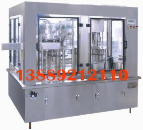 本机主要用于饮料的灌装作业。本机集冲洗、灌装、旋盖三功能合在一个机体上,全过程实现自动化,适用于聚酯瓶、塑料瓶灌装果汁、矿泉水、纯净水,加上温控装置还可以进行热灌装。各部分的试用瓶型调整采用手柄转动实现,轻松自如,简单快捷。灌装方式采用了新型的微等压灌装,使灌装速度跟快更稳定,所有与同规格的机器相比本机的产量更高,效益更大。本机采用了先进的可编程的控制器(PLC)控制机器自动运行,进瓶链道采用风送方式,与主机变频器相互配合使用进瓶运行更稳定可靠。光电检测各部件的运行状况,所有自动化程度高,操作简便。再次基础上,本机变更光装部分可以形成低真空灌装方式。是饮料生产厂家理想的首选设备。