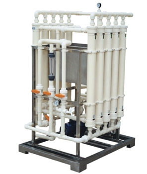 超滤膜是本设备的主要组成部分,其材质为聚丙烯腈中空纤维膜,有效孔径大约为:0.005~1μm(1μm=10-4cm),分子截留量为100000单位,利用超滤膜表面孔径机械筛分作用,膜孔阻塞、阻滞作用和膜表面及膜孔对杂质的吸附作用能去除水中的大分子有机物、胶体、蛋白质、各菌酶、细菌、病毒、热源等,并能保留水中的矿物质,从而达到山泉水标准