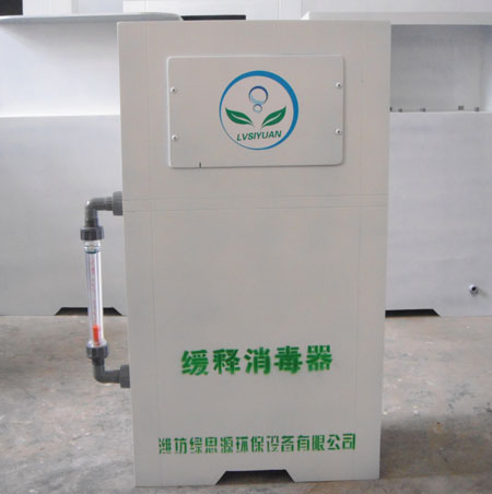 本公司生产研发了一款实用新型二氧化氯固体原料缓释消毒器,它包括箱体(1),在箱体(1)的两侧分别设有进水口(2)和出水口(3);特征为,进水口(2)和出水口(3)之间连接有缓释管(4),在缓释管(4)上方设有1个或1个以上的带有密封盖(10)的投药室(5),在投药室(5)下方的箱体(1)内设有水平隔板(6),在每个水平隔板(6)的前方设有竖直挡板(7),竖直挡板(7)上有过水口(11)。本实用新型具有结构简单,制作成本和使用成本低,消毒药剂投入量精确的优点,而且一次放入消毒药剂以后可以使用很久,不需要专人的操作。因此本实用新型不仅适用于城乡生活饮用水的消毒,还可以用于对生活、医院、工业产生的废水消毒处理,使其达到排放标准。