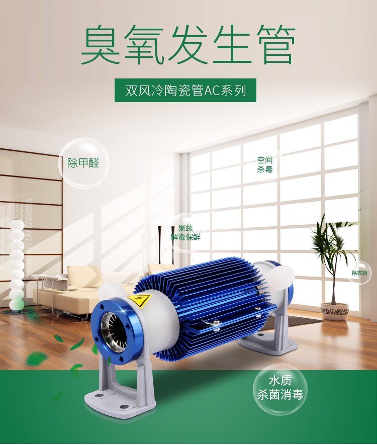 双风冷陶瓷臭氧管ZA-AC系列,严格经过625道生产工艺完成,耐高压可达到9.5千伏;