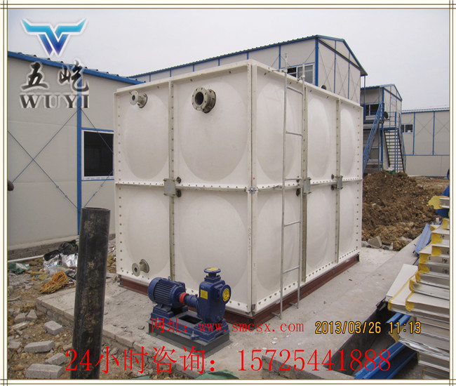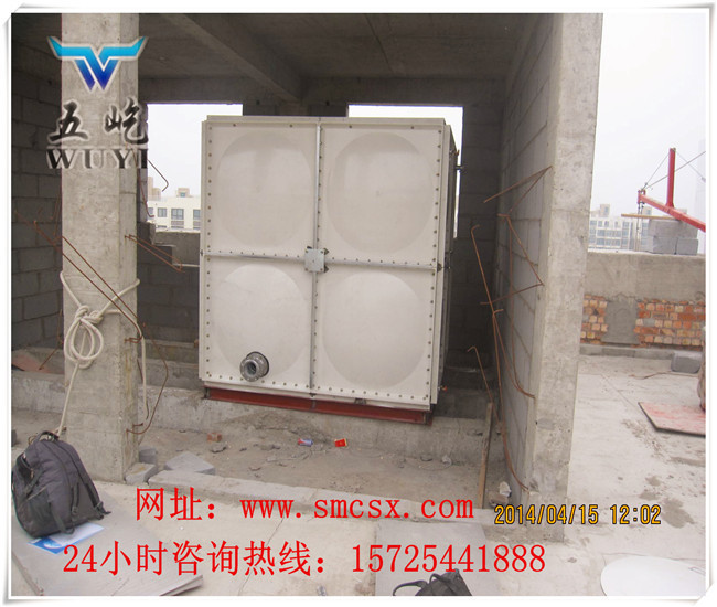 玻璃钢组合式房顶水箱(www.smcsx.com)是由 SMC 模压板块、密封材料、金属结构件及配管系统现场组装而成。给设计和施工带来极大方便。一般水箱按标准设计,特殊水箱需要专门设计。可根据用户需要组装 0.125~1500 立方米的水箱。若原有水箱需要更换,不需要改造房屋,适应性很强。专门研制的定型产品密封带,该密封带无毒、耐水、弹性大、永久变型小,紧固密封。水箱整体强度高,无渗漏,无变行,保养,检修方便。玻璃钢组合式房顶水箱_【五屹水箱】