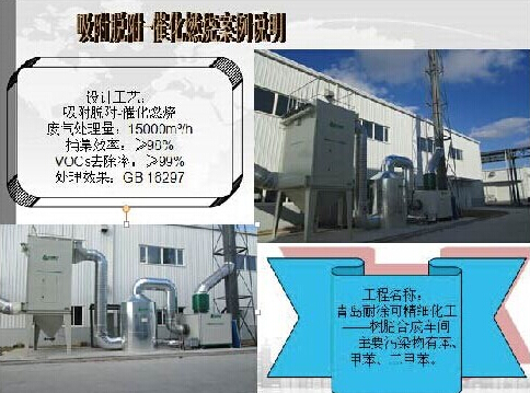 催化燃烧工艺主要是在催化燃烧装置中进行的。有机废气首先通过热交换器预热到200-400℃,再进入燃烧室,通过催化剂床时,碳氢化合物的分子和混合气体中的氧分子分别被吸附在催化剂的表面而活化。由于表面吸附降低了反应的活化能,碳氢化合物与氧分子在较低的温度下迅速氧化,产生二氧化碳和水。