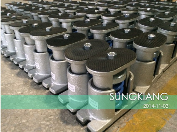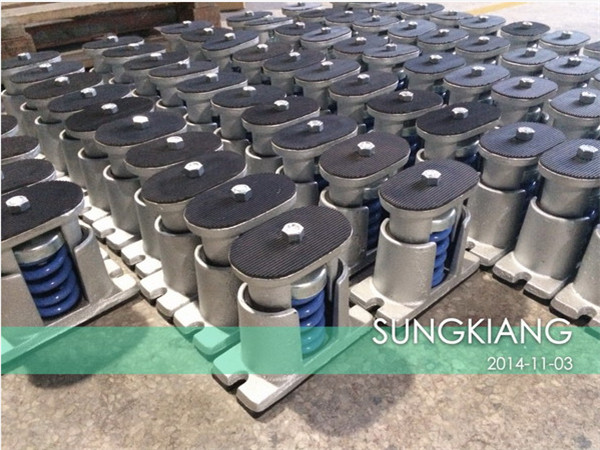 本体材质分为特殊强化尼龙及球状铸铁。特殊强尼龙材质为尼龙加强化纤维,强度极佳;尼龙材质可耐酸碱,防紫外线,并经严格老化测试,品质优良,安全性高。球状铸铁本体经热浸镀锌处理,耐候性佳。外型轻巧坚固,安装容易;适用于各类机械内避震装置。弹簧均经热处理、ED防锈、烤漆等程序处理。荷重挠度25mm、40mm能有效消除机械结构振动。尼龙材质工作温度0℃-50℃。
