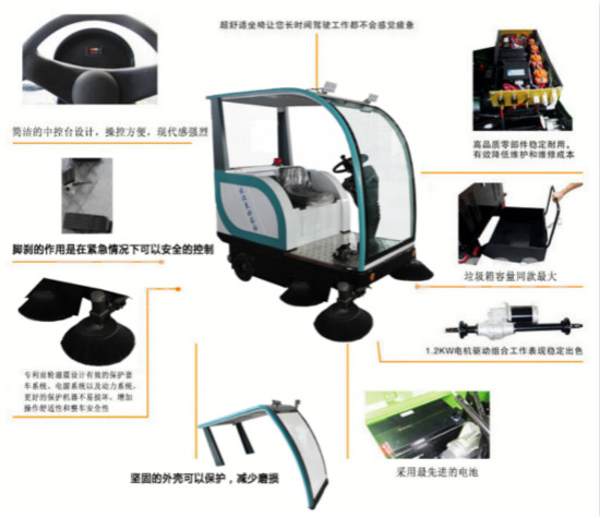 电动驾驶式扫地车 F1400M采用吸尘扫地的自动清洁体系,此款扫地车主要用于工矿、企业、大专院校、高档别墅区地面平坦、环境相对良好的场所。
