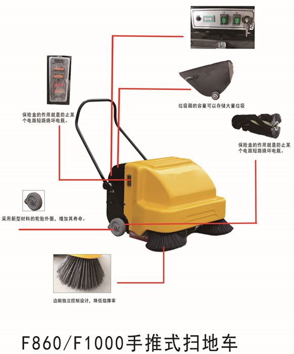 FL-860/FL-1000手推式扫地车特别适合于大厅、候机候车室、医院、工厂、小区道路等场所的使用,清扫时无扬尘,无噪声,手推式扫地车可以在人群中灵活穿梭,结构轻巧,推行轻便,维修简单。