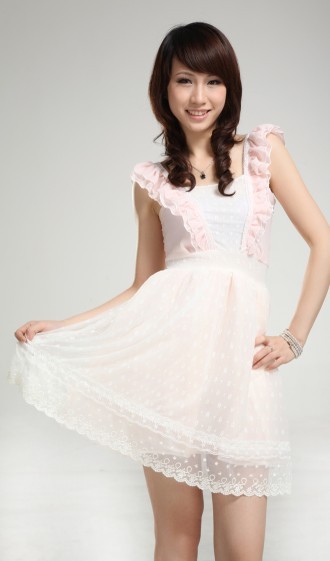 供应日韩可爱清纯气质粉蓝公主裙学生裙胸前蕾丝绣花连衣裙