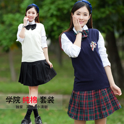 长袖衬衣+毛线背心+西裤/裤裙(韩版校服):长袖衬衣(涤棉平纹衬衣面料,45支纱,35%棉,65%涤);毛线背心(纯棉线纱);西裤/裤裙(制服呢或罗尔呢,250克—270克,100%化纤);价格面议,欢迎来电咨询。