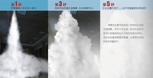 接到报警主机或者其它设备的控制信号后,烟雾系统可瞬间启动,在几秒钟内释放大量无毒的烟雾,瞬间充满房间,让闯入者能见度为零,只能仓皇逃走。