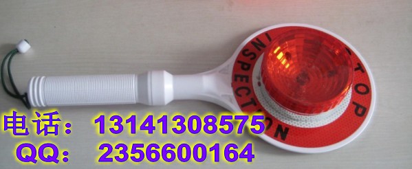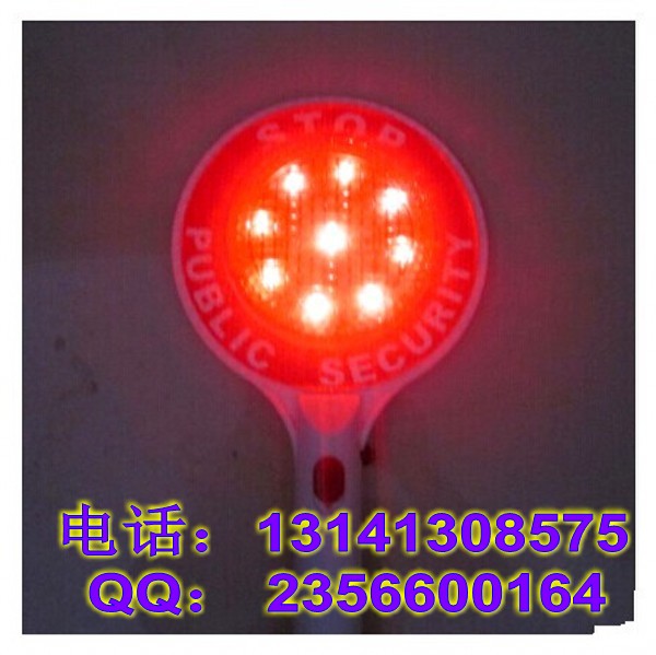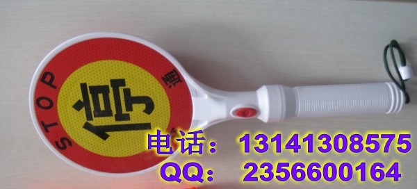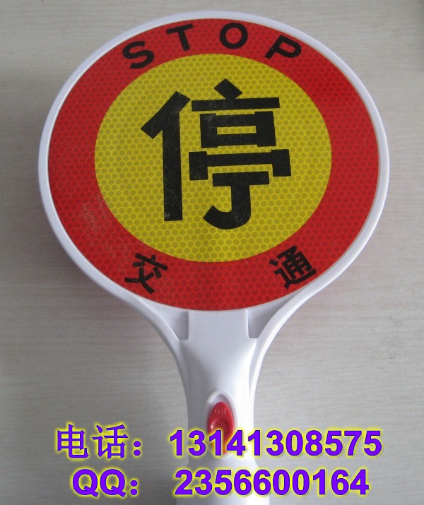 产品说明:总长度为41cm,圆盘直径为18cm、手柄长度为23cm,配2号电池使用,一面是一只高亮灯泡,另一面有“停”字样。前面有高强反光性能,后面为高亮灯泡,警示性强!