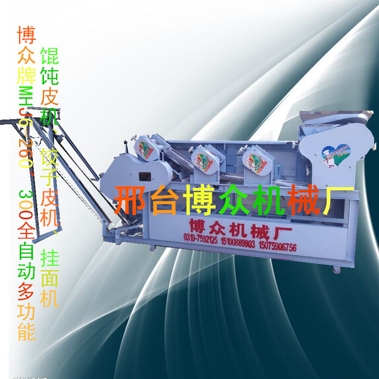 多功能挂面机你买我就送+刀具+模具+拌面机 速速订购吧 多功能压面机 挂面机 面条机,质量保证,欢迎咨询洽谈。 该机轧辊分钢辊和铸伯辊两种,轧辊表面经过磨床精磨,光滑美观,轧出的面条均匀带光洁,保证了良好的挂面质量。轧辊采用倾斜45度或60度排列,且开当大、固定牢、便于操作、安全卫生,宜于眼观。传动采用减速机和链条传动,整机布局得当、压延比、分配合理,传动平稳,传达室动动力准确高效,还有噪音小、无震动、性能优越等特点,可配套小型烘干设备,是中小型挂面生产企业的理想产品。 主要特点:多组精铸钢辊、表面拉丝、加强机帮。专用减速箱减速、链条传动,噪音低、寿命长、功率高、耗能低。 自动喂料、自动断面、自动上杆。 一、产品介绍 面条是我国人民所喜爱的主食品种,市场需求巨大,永远不愁销路,是充满商机的投资项目。博众全自动面条机(全自动挂面机 压面机),是一种新型面条流水线设备,该机从进料到出面连续作业,具有高产高效、省时省力、操作简便等优点,生产的面条 挂面韧性好、口感好。博众面条机畅销全国并出口到20多个国家和地区。博众机械是中国面条机设备的主要生产厂家,博众面条机价格合理,购买压面机器设备,免费现场培训面条的做法、面条挂面制作、面条加工等面条、挂面生产工艺与技术,让面条生产者、投资者轻松创业! 二、性能特点 1、采用齿轮传动,运转平稳、安全可靠。 2、采用自动挑条系统,效率高、质量好。 3、自动输送、自动断面、自动上杆,一次成型。