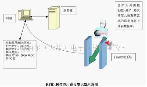 如上图所示,当护士抱着婴儿离开时,婴儿腕带的识别信息必须和母亲识别信息匹配才能离开,如果信息不匹配,门禁系统将会发出警报,在可以有效防止婴儿被抱错。