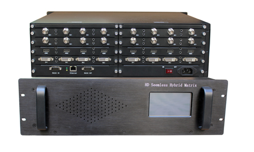 高清混合矩阵矩阵是为了将各种模拟或数字视频信号统一进行重新分配和组合的交换设备。该设备可将多路CVBS、VGA、YPbPr、HDMI、DVI和 SDI视频输入信号切换到多路输出通道的任意通道上去。且输出通道可任意选择CVBS、VGA、YPbPr、HDMI、DVI或SDI接口。可广泛用于需 要进行多种视频信号分配和组合的场合,应用领域涉及军工、多媒体教学、电视电话会议、金融、科研、气象等领域。