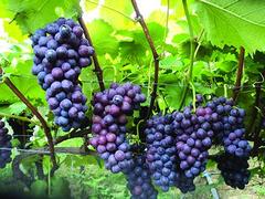 巨峰葡萄是生产中的主栽品种之一,适应性强,抗病、抗寒性能好,喜肥水。果实穗大,粒大,平均穗重400-600克,平均果粒重12克左右,大的可达20克。8月下旬成熟,成熟时紫黑色,果皮厚,果粉多,果肉较软,味甜、多汁,有草莓香味,皮、肉和种子易分离,含糖量16%。