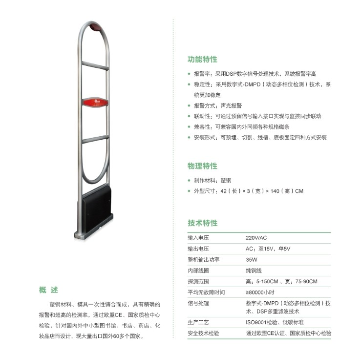 概述:塑钢材料、模具一次性铸合而成,具有精确的报警和超高的检测率,通过欧盟CE、国家质检中心检验,针对国内外中小型图书馆、书店、、药店、化妆品店而设计,现大量出口国外60多个国家。