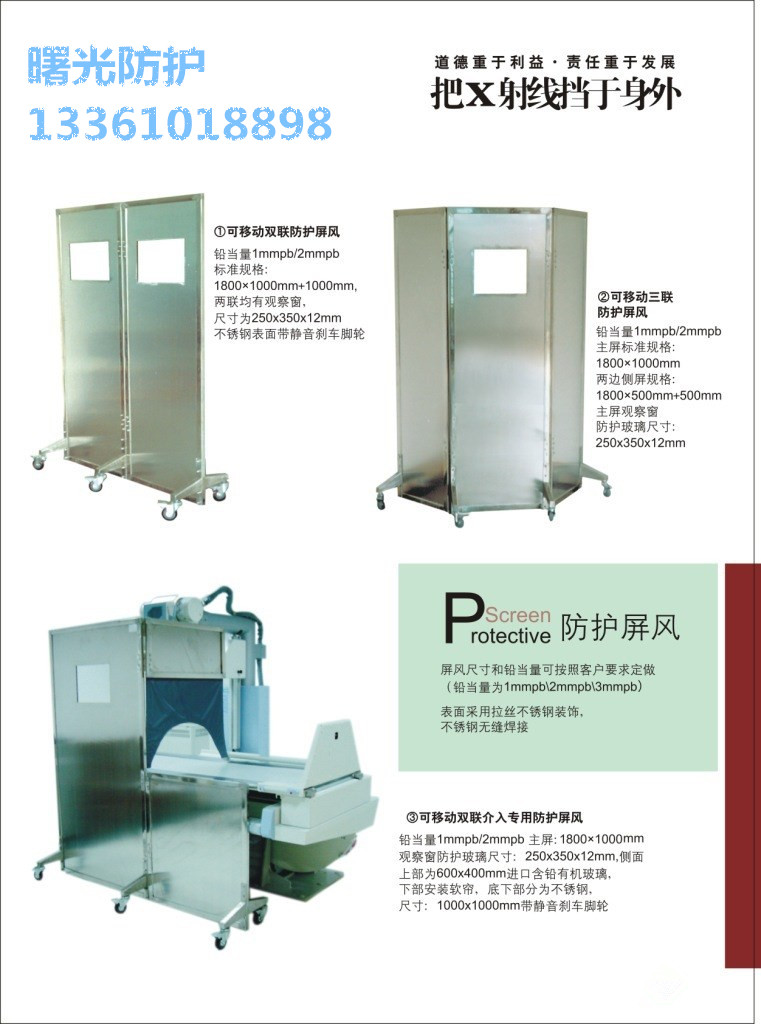 (1) 屏蔽作用:外面为不锈钢钢板,一般尺寸大小为高2150mm*宽1300mm*厚100mm,内设龙骨,衬2-3mm屏蔽板(根据不同的科室的射线仪有不同的材料要求与厚度要求),使工作人员剂量达到国家管理目标值。