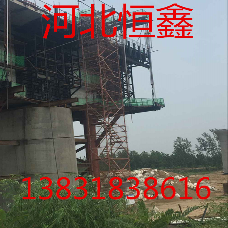 阜城县恒鑫安全爬梯是为桥梁墩柱施工专用的安全人行通道,可为施工及检查、监理人员提供安全、舒适、便捷的上下通道。其主要构件为立杆、横杆、横撑、斜杆、梯子、扶手等。该脚手架组成的框架在三维空间结构强度高、整体稳定性好、具有可靠的自锁性能,并能更好的满足各种安全施工的需要。高墩安全爬梯,其特征在于:它包括由多个自下而上连接的爬梯单元构成的梯架以及连接于梯架和建筑结构之间的固定组件;所述爬梯单元包括脚手架单元、斜架设于脚手架单元上下部之间的阶梯以及水平设置于脚手架单元上部且位于阶梯旁侧的行走板。本实用新型的目的在于提供一种安全爬梯,不仅制作简单、拼装容易、方便,而且结构稳固,安全性高,是路桥高墩施工首选,深受广大用户认可!