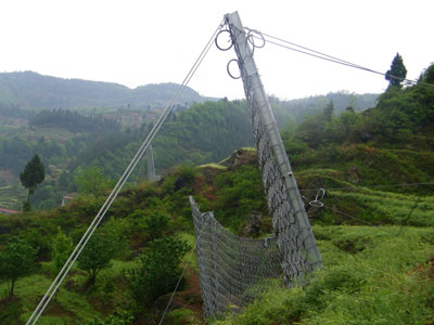 RX-050(普通常用型) DO/08/200同RX-025[钢柱(间距10M),带消能环的∮16双支撑绳和∮16“人”字形上拉锚绳(每跨6个消能环),∮16侧拉锚绳(单绳),/08/200/4*5㎡钢丝绳网,∮8缝合绳格栅网]拦截撞击能500kj以内的落石