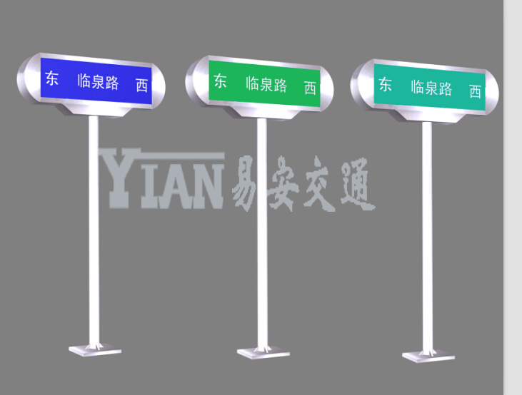 新型路牌有三种类型,其高度都是2.5,只是长度和宽度有所不同。这三种类型分别是:设置于支路的立杆式小号路牌、设置于主次干路的立杆式大号路牌、设置于主次干路交叉口的直角式路牌。设置于主干路及次干路的路牌,牌面尺寸为1500毫米x 450毫米;设置于支路的路牌,牌面尺寸为1200 x 360毫米;设施在主干路与主干路、主干路与次干路交叉口的直角式路牌,牌面尺寸为1500毫米x 360毫米。新型上海第四代路牌其主体为蓝底白字,更为醒目,设置在主次干道上的路牌高2.5米,版面为2mm铝型材用内部链接件链接两块版面,使路牌达到双面指示的效果,面贴按《公路交通标志反光膜》要求的钻石级反光膜,再采用丝网印刷技术印刷底色及文字内容。