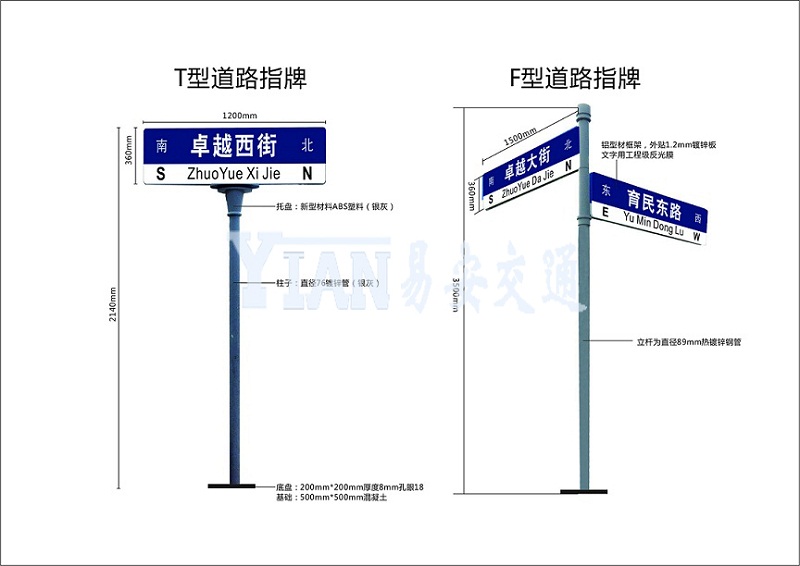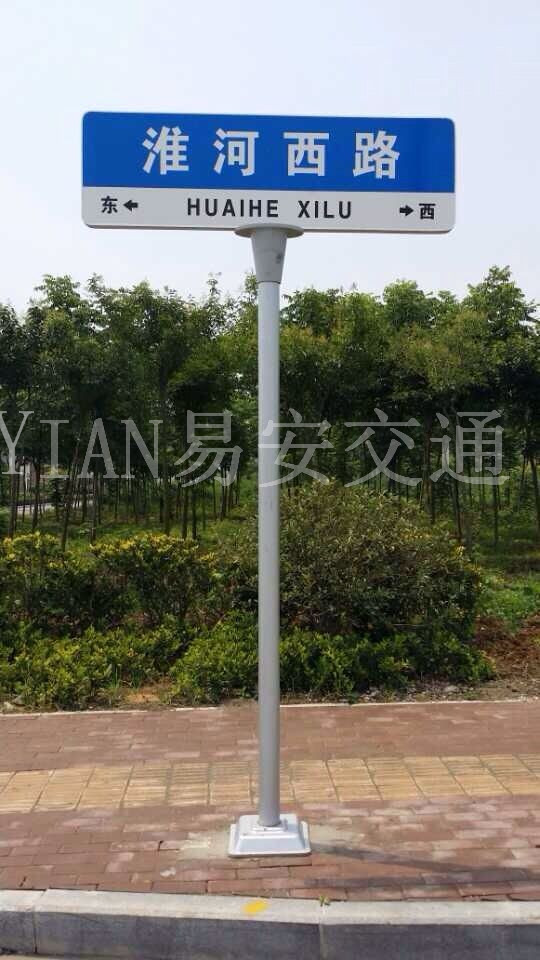 交通路名牌分为单悬臂式路名牌、双悬臂式路名牌、双柱式路名牌、单柱式路名牌、热镀锌路名牌及各种立柱。