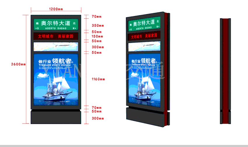 4、指路牌灯箱科技含量大、自动化程度高:能实现多画面24小时自动来回往复播放;可根据画面内容示时长设置不同的停顿时长。
