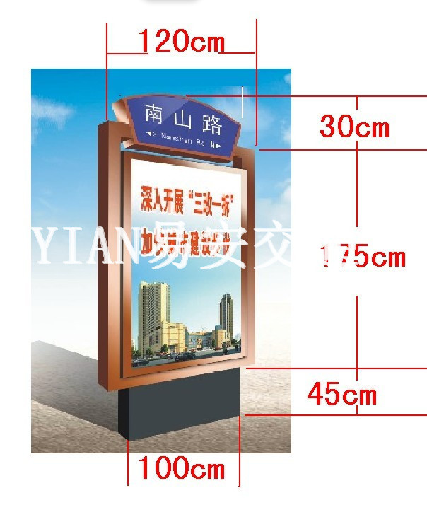 宿迁市易安交通设施有限公司创建于2004年3月6日,位于江苏省宿迁市宿豫区高新技术产业开发区嘉陵江路8号,专注于制作指路牌、指路牌灯箱、地名牌、道路指路牌 、公路指路牌、城市道路指路牌、T型指路牌、F型指路牌、多方向指路牌、不锈钢指路牌、LED灯箱指路牌、天津仿罗马柱欧式指路牌、上海第四代指路牌、江苏指路牌产品十余年;同时主营开发、设计、加工制作、安装公交候车亭、广告垃圾箱灯箱、社区阅报栏灯箱、宣传栏等产品。以质量求生存、以品种图发展、以信誉争市场、以管理促效益,用心的制作,贴心的服务,顾客至上,锐意进取。小投入、高回报,易安与您合作共赢,我们将建立一支优秀的广告队伍,无论您在何处都会享受到易安的完美服务,欢迎新老顾客光临!