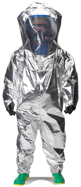 ·全封闭正压呼吸器内置式防化服。两件式设计,外层为玻璃纤维镀铝隔热防护层,可抵御95%以上的1600度高温热辐射,防护闪燃爆燃,具有阻燃功能,可防护1400度高温钢水的泼溅。