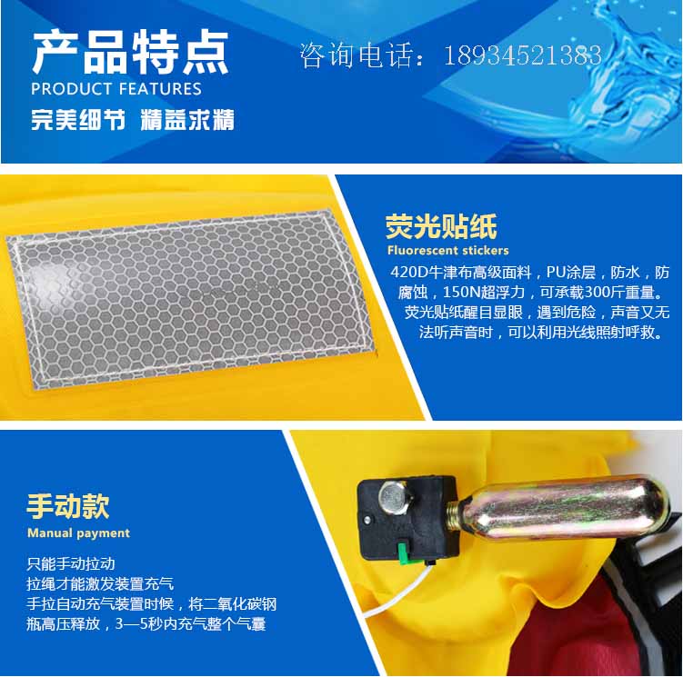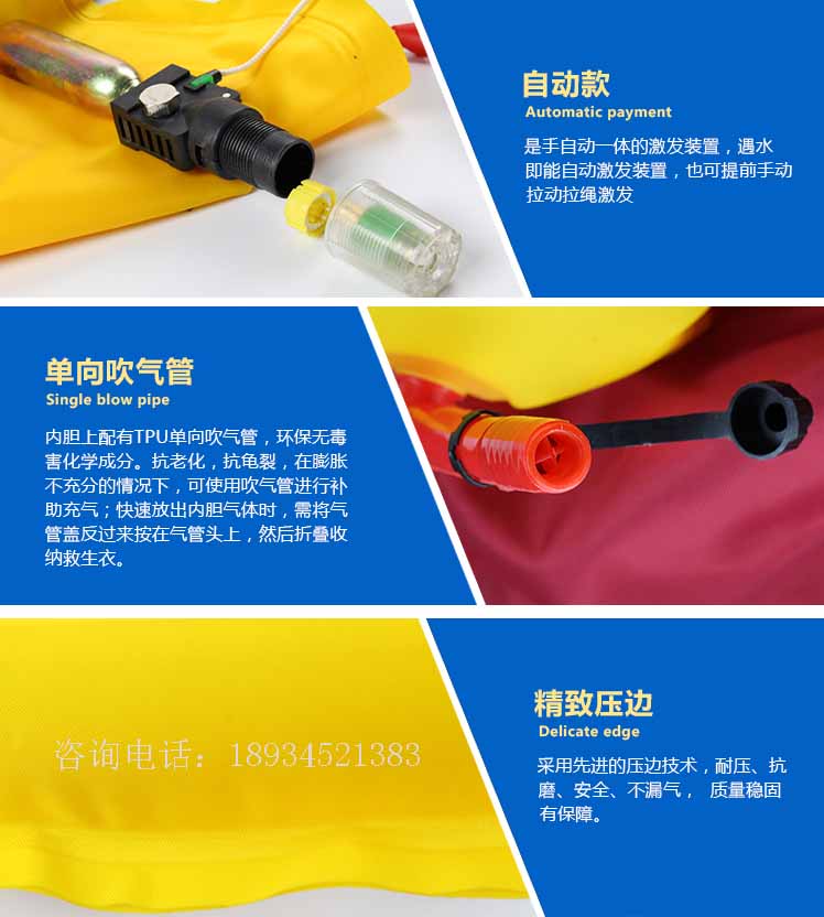 3、遇紧急情况下,可先手拉充气装置,也可直接跳入水中,自动充气装置入水后即可自动充气;如在水中时间过长,气室气体不足时可用嘴吹气管补气。