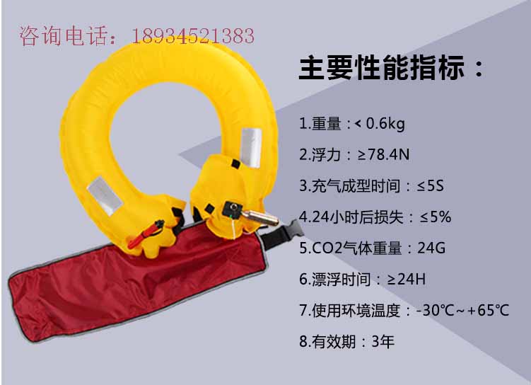 腰带式气胀救生圈主要技术参数:1)重量:<0.6kg;2+浮力:≥78.4N;