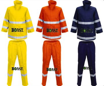 02款消防服衣料与特点:由防火表层,隔水层,隔热层和阻燃舒适里料组成,防撕破结构,隔水层具有优良的防水,耐温和透湿性能,隔热层和阻燃里料提供额外的阻燃和耐热热保护,口袋大保证携带容量;特殊设计的衣领、前牌封闭系统、袖口与裤脚口能有效防止火焰和热量直接与身体接触;肩袖一体化与护膝垫的设计更增加了衣服的强度耐用性和灵活机动性。采用Aramid永久性阻燃线缝制,安装优质进口阻燃反光带。此款战斗服由于防护性能可靠、重量较轻、价格中偏低而为许多专业消防机构选用.