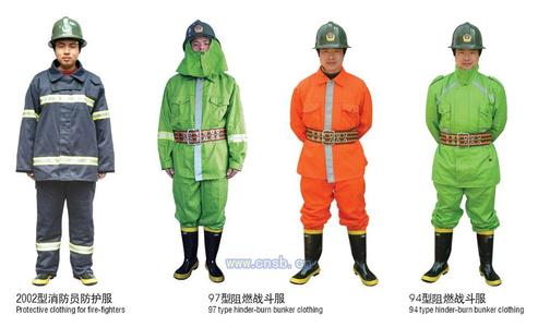 02款消防服衣料与特点:由防火表层,隔水层,隔热层和阻燃舒适里料组成,防撕破结构,隔水层具有优良的防水,耐温和透湿性能,隔热层和阻燃里料提供额外的阻燃和耐热热保护,口袋大保证携带容量;特殊设计的衣领、前牌封闭系统、袖口与裤脚口能有效防止火焰和热量直接与身体接触;肩袖一体化与护膝垫的设计更增加了衣服的强度耐用性和灵活机动性。采用Aramid永久性阻燃线缝制,安装优质进口阻燃反光带。此款战斗服由于防护性能可靠、重量较轻、价格中偏低而为许多专业消防机构选用.