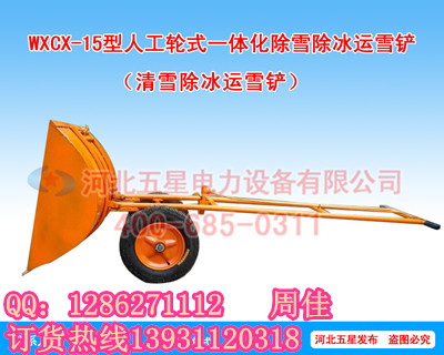 WXCX--15型人工轮式一体化除雪除冰运雪铲(清雪除冰运雪铲)是河北五星电力设备有限公司在国内首创的除雪、铲冰、运雪一站式解决方案。清雪除冰运雪速度快效率高,15个人活1个人干。除雪、除冰、运雪效率至少提高15倍