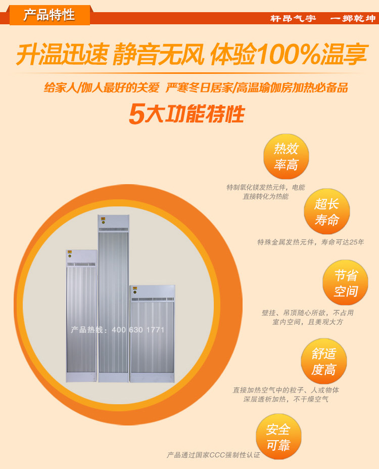人性化设计,辐射热效率高,升温快,电热转换率高达99.9%,配置精确温度控制仪,独立调节,智能控温,高能蓄热,合理使用电能.