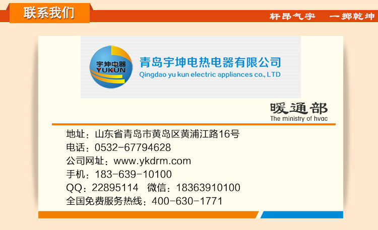 青岛宇坤电热电器有限公司研发生产各种采暖产品—有适用不同围护结构、不同供暖环境、不同供暖需求的红外辐射采暖器,电热电缆,对流式电加热器系列产品。以及各种与电暖器配套的各种型式各种规格的温度控制器。青岛宇坤电热电器有限公司并已在全国部分地区设立分公司,公司具有完善的售后服务网络和专业的设计安装团队,为消费多年来,我们一直坚持“质量是企业的生命”,“创新是企业的灵魂”,“服务是我们的责任”,始终坚持“精益求精、不断创新”的企业精神,提倡以人为本、质量优良、造福人类的企业文化为体系,为广大消费者提供品质一流的新型、环保、健康的电采暖产品,让您在寒冷的冬季享受到春天阳光般的温暖,体验健康采暖、绿色采暖带给您的幸福生活。