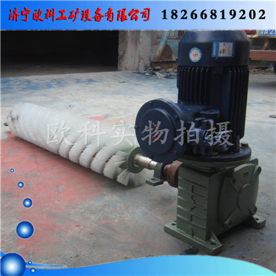 电动滚刷清扫器位于输送机回程输送胶带下方,有电动机或者驱动滚筒驱动圆柱型清扫刷,刷尖与带面轻微接触,清扫刷的旋转方向与回程输送带的运行方向相反,从而将粘在带面上的微料刷扫下来,达到彻底清洁的目的。