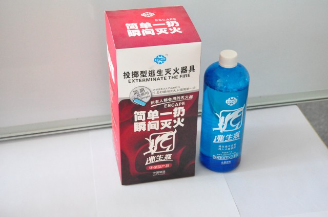 产品名称: 灭火逃生瓶,全称投掷型灭火器(ESCAPE),是一种水系灭火剂,为浅黄色液体。在零下20度以下,也可以正常使用,且效果不变。本品属于低温非浓缩发泡灭火剂,可以直接使用无需与水混合,与标准的泡沫混合器和其他发泡装置均可兼容,也可与相容性干粉灭火剂联用。 产品规格: 分为背包式和壁挂式两类,有效期分为2年期和5年期两种 灭火原理: (1)阻断yang气:ESCAPE灭火瓶中的灭火剂在遇热后会产生二yang化碳,二yang化碳阻断了燃烧面和yang 气的接触,从而抑制了燃烧的发生 (2)抑制化学连锁反应:ESCAPE灭火瓶中的灭火剂在遇热后发生作用产生an气,an气可以形成燃烧连锁反应的负触媒 (3)冷却效果:ESCAPE灭火瓶中的液体从被投掷到火源附近的树脂瓶内飞散而出。此时,水分瞬间蒸发而使燃烧物迅速冷却,同时遇热后产生的an气,也起到了降温的效果 (4)防止复燃:灭火剂中的部分成分可以使燃烧物的燃点升高,同时遇热后产生的稳定的、丰富的泡沫也对可燃物形成了很好的覆盖从根本上杜绝了复燃的可能性 产品特点: 1.快速:初起火源,2秒灭火 2.简单:无需培训使用方法 3.易用:老幼妇女都能用,灭火后不复燃 4.全面:普通火、油火、电火都适用 5.安全:远距离投掷,无需靠近火源,从容灭火 6.耐冷:零下20度不会结冰 7.环保:PH值为中性,对人体无刺激,灭火后对周围物品污染小 8.长久:保质期2年或5年,保质期内无需年检 9.经济:布置简单、占地小、时效长、效果好 10.优美:颠覆传统灭火器笨重形象,成为饰品 适用范围: 1.营业场所:银行、饭店、酒店、加油站、超市等 2.公共场所:展览馆、幼儿园、学校、敬老院、yi院、影剧院、图书馆、博物馆、教堂、餐厅、商店等 3.起居场所:住宅、公寓、旅馆等 4.工厂:石油化工厂、食品厂、精密工厂、危险品工厂、一般工厂等 5.交通工具:公共交通、junshi交通、运输车辆、feiji、huoche、小型汽车、载客船只、游艇、渡轮以及其它航海用途上(引擎间、船客船舱)