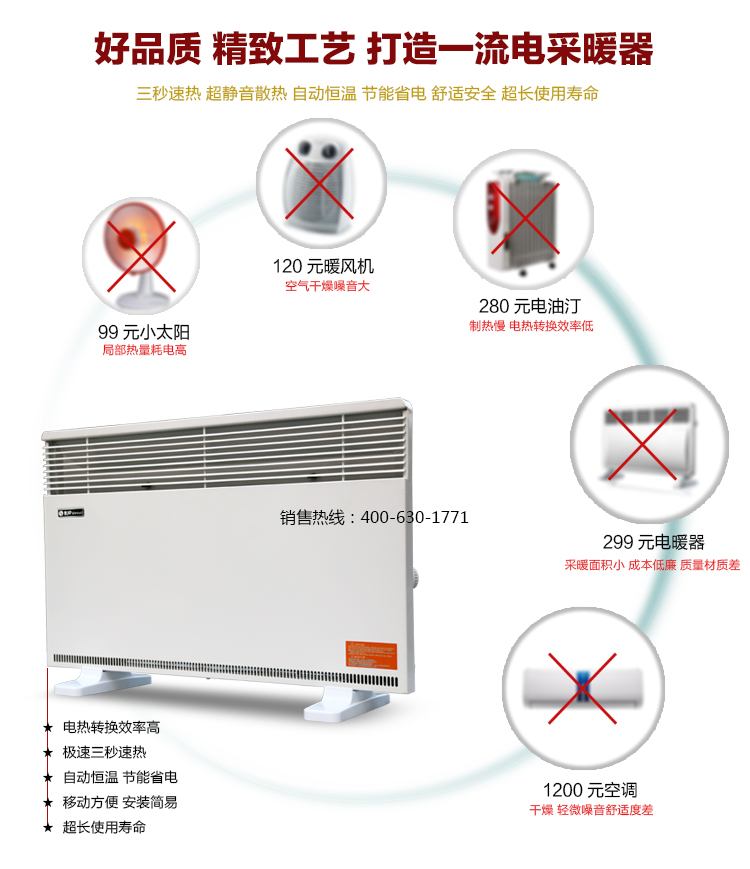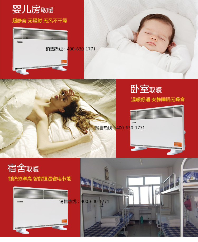 1、舒适运行:充分利用空气自然对流循环加热,使产品做到超静音运行,提供恒温的舒适环境且不干燥,让您回归到自然生态的取暖方式。