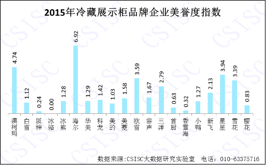 2015年度《中国冷藏展示柜品牌口碑研究报告》显示,企业美誉度方面,澳柯玛等对企业公益、企业创新等正面民情给予了较高的关注,品牌指数成绩远远领先先于其他品牌;欧雪、星星、雪花等品牌的美誉度表现同样亮眼;其他多数品牌由于自身收入盈利能力的限制,在本维度欠佳。